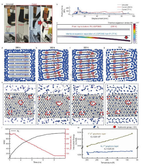 a,照片展示了在298 K和77 K温度下,使用未固化和已固化的PDMS从PI基底上剥离LIG的过程。b,剥离过程的实验结果,显示了上述样品在180°剥离测试中剥离力随位移的变化。c,有限元模拟结果揭示了在没有外部机械力的情况下,通过将温度从298 K降低到77 K,互锁的LIG和固化PDMS从PI基底界面分离的过程。d-g,分子动力学模拟结果的快照,显示了在10 ns内将温度从298 K降低到77 K时,多孔缺陷石墨烯的层间结构变化;h-k,分子动力学模拟结果的快照,显示了在10 ns内将温度从298 K降低到77 K时,第一层石墨烯晶面的晶格畸变。l,冷却过程中N2分子的均方位移(MSD)扩散系数结果。m,计算了冷却过程中第一层和第二层石墨烯之间以及第一层石墨烯和N2分子之间的相互作用能。