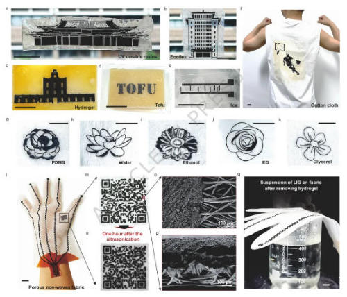 图示为通过低温剥离法将LIG图案转移到紫外光固化树脂、Ecoflex和水凝胶上的建筑物形状图案(a-c),以及分别转移到豆腐和冰上的文字和叉指电极图案(d-e)。f,通过低温剥离法将描绘篮球运动员的大尺寸LIG图案转移到浸有未固化水凝胶的棉背心表面。g-k,通过低温剥离法将各种花形LIG图案分别转移到吸收了未固化PDMS、水、乙醇、乙二醇(EG)和甘油的无纺布上。l,使用蜂蜜基水凝胶溶液作为转移介质,将LIG电极转移到无纺布上,制成个性化医用智能手套。m-n,手套上LIG二维码图案在超声处理前后一小时的照片,用于评估机械稳定性。o-p,去除转移介质后,织物上悬浮LIG的俯视图和横截面SEM图像。q,去除转移介质后,带有LIG图案的智能手套照片,用于验证气体渗透性。比例尺:2 cm。