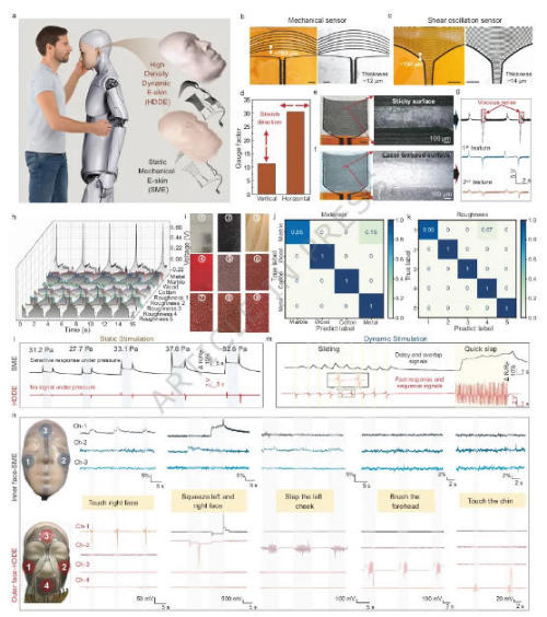 a,通过触摸机器人面部的双层电子皮肤(即HDDE和SME)实现人机情感交互的概念。b-c,分别转移到PDMS之前和之后,额头上的机械传感器和剪切振荡传感器的照片,厚度分别约为12 μm和14 μm。传感器的线宽分别为750 μm和150 μm。比例尺:1 cm。d,用于应变传感的机械传感器,测量了垂直和水平拉伸方向的应变系数。e-f,下巴上剪切振荡传感器的固有粘性表面和激光纹理表面的照片(左)和光学图像(右)。比例尺:1 cm。g,机器人面部下巴上叉指电极在粘性PDMS表面和粗糙表面经过一次或两次激光纹理处理后的电压输出。 h、HDDE的电压输出,用于区分由不同材料制成且表面粗糙度不同的蒙特梭利触觉板上的触觉信号。i、蒙特梭利触觉板的照片,包括金属、大理石、木材、棉布以及表面粗糙度从1到9依次递增的触觉板(从上到下,从左到右排列)。j-k、由不同材料制成且表面粗糙度不同的蒙特梭利触觉板的分类混淆矩阵结果。l-m、SME和HDDE在静态和动态刺激下的输出。n、机器人面部内外两侧两层SME(三个通道)和HDDE(四个通道)在不同交互(例如触摸、挤压、拍打和刷拭)下的实时静态和动态响应。