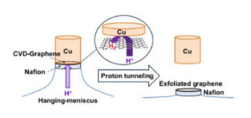 日本名古屋工业大学的Katsuyoshi Ikeda研究团队报道了一种基于质子隧穿效应的电化学新方法,可实现化学气相沉积(CVD)制备的单层石墨烯从铜(Cu)催化基底上快速剥离。该研究首先通过动力学分析和同位素效应,直接证明了石墨烯在电化学电势下的质子渗透主要源于量子隧穿效应,而非通过缺陷的经典热扩散。利用这一机理,研究团队开发了一种使用质子导体Nafion作为支撑层的电化学剥离技术,仅需10秒即可完成石墨烯剥离,且铜基底可重复用于CVD生长,克服了传统化学蚀刻法耗时数小时、消耗基底的限制。