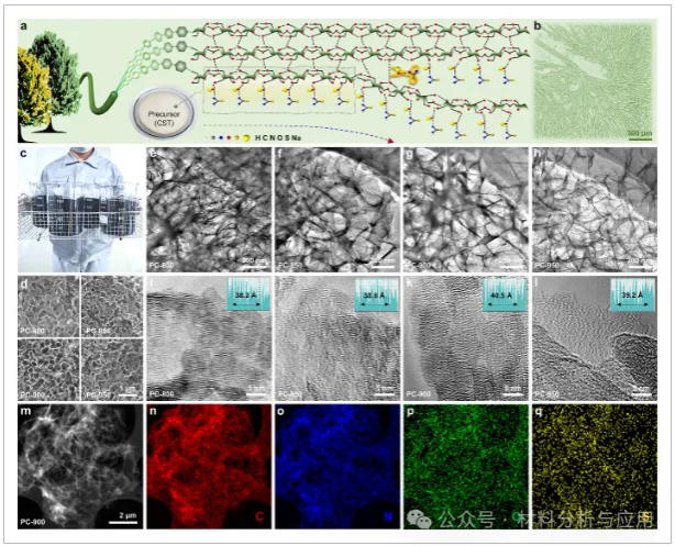 图1、Illustration of synthesis and morphological characteristics of carbon products (PC-800, PC-850, PC-900, and PC-950). (a) Schematic of precursor preparation. (b) Photo of CST complex. (c) Photo of 1 kg of the targeted product, i.e., PC-900. (d) Scanning electron microscopy (SEM) images. (e–h) Transmission electron microscopy (TEM) images. (i–l) Corresponding high-resolution TEM (HRTEM) images. (m–q) High-angle annular dark-field scanning TEM (HAADF-STEM) image with elemental mapping of PC-900.