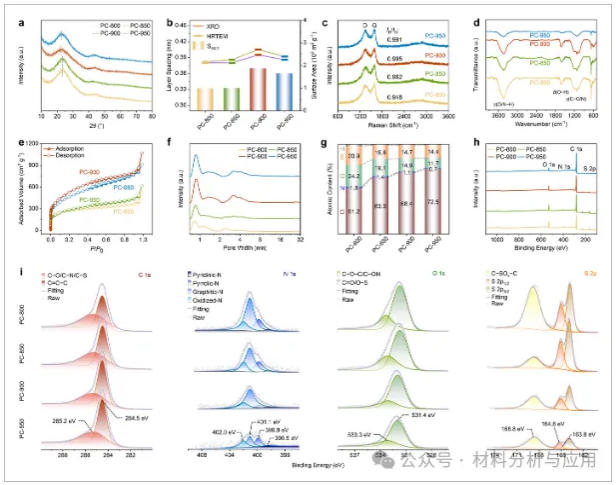 图2、Spectroscopic characterizations of a series of synthesized carbon materials. (a) XRD patterns. (b) Comprehensive comparison of interlayer spacing and specific surface area. (c,d) Raman and FTIR spectra. (e,f) Nitrogen adsorption-and-desorption isotherms with calculated pore-size distributions. (g) Quantitative elemental analysis (EA). (h,i) XPS spectra with deconvolutions.