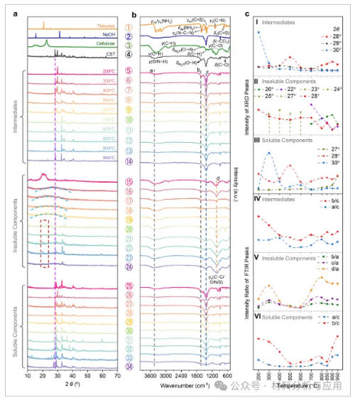 图3、Mechanism of pyrolysis of the precursor. (a,b) Ex situ XRD and FTIR spectra of a series of intermediates ⑤–? collected at designated temperatures during pyrolysis. The corresponding intermediates are further divided into insoluble ?–? and soluble ?–? components to separate signals of these residues. (c) Intensity changes of XRD peaks in (a) and FTIR peaks in (b).