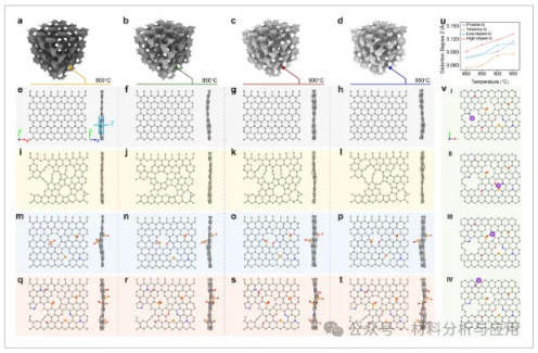 图4、Structural simulations of various carbon materials. (a–d) Cartoons sketching carbon materials obtained at different annealing temperatures. Four models of (e–h) pristine-G, (i–l) vacancy-G, (m–p) low-doped-G, and (q–t) high-doped-G under the corresponding annealing temperatures. Black spheres are carbon, blue are nitrogen, orange are sulfur, and red are oxygen. (u) Distortion degree of carbon layers of the four models versus the annealing temperatures. (v) Adsorption configuration of potassium on carbons.