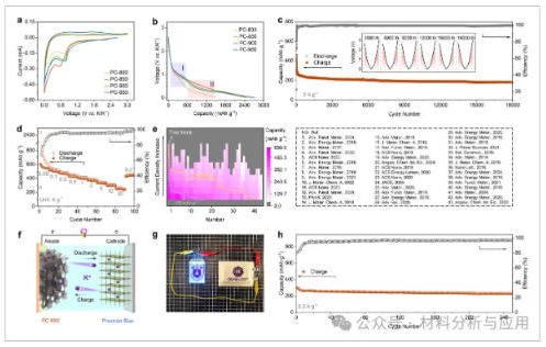 图5、Electrochemical behaviors of the carbon materials as anodes in PIBs. (a) CV curves at a scan rate of 0.05 mV s?1. (b) First discharge curves at 0.05 A g?1. (c) Long-term cycling performance of PC-900 at 2 A g?1. (d) Rate performance of PC-900. (e) Summary of rate performances of recently reported carbon-based anodes for PIBs (original data available in Table S2). (f–h) Schematic and photo of a full cell of PIBs, as well as its cycling performance.
