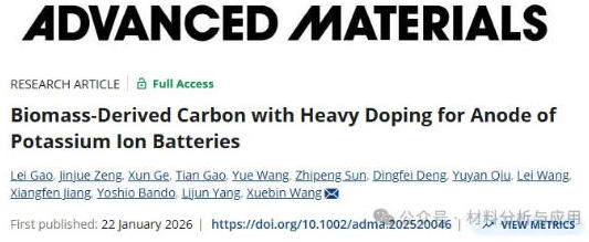 钾离子电池(PIB)有望成为绿色电网大规模储能的经济高效候选方案。对于PIB负极,碳材料因其导电性和丰富性而极具潜力。然而,碳负极不足的循环寿命和倍率性能仍是制约PIB发展的瓶颈,其根源在于石墨层间距较窄与钾原子半径较大的不匹配。本文,南京大学王学斌 教授团队在《ADVANCED MATERIALS》期刊发表名为“Biomass-Derived Carbon with Heavy Doping for Anode of Potassium Ion Batteries”的论文,研究通过在生物质衍生的碳材料中掺入大量杂原子(18.2 at%),成功解决了这一问题。由此合成的碳材料不仅改善了层间距,还获得了活性位点和介孔结构。这些特性共同赋予其卓越的循环寿命(18000次循环)和倍率性能(20 A g?1时达260 mAh g?1),使其成为面向电网储能的PIBs理想候选材料。