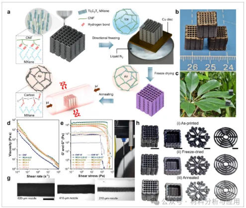 图1、Preparation and printability of A-MCA. (a) Schematic illustrating the preparation process for A-MCA. (b) Photograph of the prepared aerogels, demonstrating their excellent printability, repeatability, and structural stability. (c) Photograph showing the aerogels standing freely on plant leaves, emphasizing their low density. (d,e) Rheological properties of CNF and MCA inks at different compositions, including shear viscosity (d) and storage (G') and loss moduli (G'') (e). (f) Photograph of MCA ink extruded from a nozzle. (g) Optical images of MCA filaments dispensed from nozzles with various inner diameters. Scale bar is 500 μm. h) Photographs of different 3D-printed architectures, including a 3D square lattice, shell box, snowflake, and overhanging structure, after 3D printing (i), freeze-drying (ii), and annealing (iii). Scale bar is 5 mm.