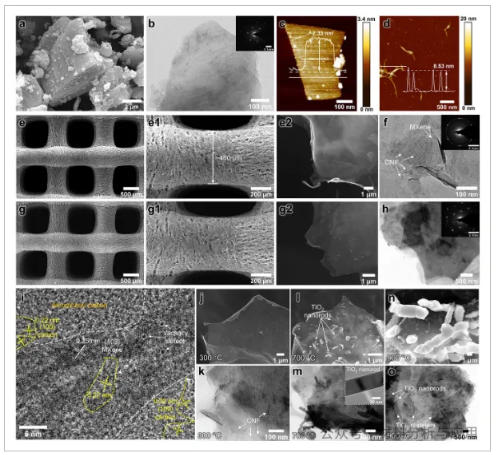 图2、Morphology of the nanofillers and aerogels under different heat treatment conditions. (a) SEM image of the Ti3AlC2 MAX precursor. (b) TEM image of the prepared Ti3C2Tx MXene nanosheets, with the SAED pattern shown in the inset. (c) AFM image and height profile of the Ti3C2Tx MXene nanosheet. (d) AFM image and height profile of CNF. (e) SEM images of the MCA-4 scaffold at different magnifications. (f) TEM image of MCA-4, with the corresponding SAED pattern in the inset. (g) SEM images of the A-MCA-4 scaffold annealed at 500°C at different magnifications. (h) TEM image of A-MCA-4 annealed at 500°C, along with the corresponding SAED pattern in the inset. (i) HRTEM image of A-MCA, showing mixtures of MXene and carbon phases. (j,k) Morphology of MCA-4 annealed at 300°C, obtained using SEM (j) and TEM (k). (l,m) Morphology of MCA-4 annealed at 700°C, obtained using SEM (l) and TEM (m). (n,o) Morphology of MCA-4 annealed at 900°C, obtained using SEM (n) and TEM (o).