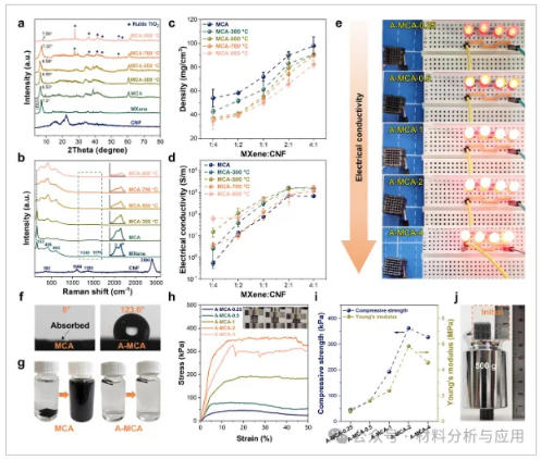 图3、Characterization and properties of aerogels. (a) XRD patterns of CNF, MXene, and MCA at different annealing temperatures. (b) Raman spectra of CNF, MXene, and MCA at different annealing temperatures. (c,d) Effects of MXene/CNF mass ratio and annealing temperature on the density (c) and electrical conductivity (d) of MCA. (e) Photographs of annealed aerogels (at 500°C) when connected to a circuit with four LEDs. (f) Water contact angle measurements of MCA and A-MCA. (g) Stability of MCA and A-MCA in water when subjected to intense sonication for 1 h. (h,i) Mechanical properties of A-MCA with different contents: stress–strain curves (h) and corresponding strength and Young's modulus (i). (j) Photograph of A-MCA-4 (110 mg) withstanding a dead weight of 500 g.