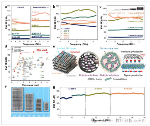 图4、EMI shielding performance of the aerogels. (a) EMI SE measurements in the X-band frequency range for 6-layer MCA and A-MCA with different MXene/CNF contents. (b) Effect of annealing temperature on the EMI SE performance of MCA-4. (c) EMI SE measurements of A-MCA-4 with different printing layers. (d) Comparison of the shielding performance of A-MCA-4 at various thicknesses with recently reported aerogels (details can be found in Table S2). (e) Schematic illustration of the shielding mechanism of A-MCA. (f) Photographs of 6-layer annealed 3D-printed samples of different sizes for testing shielding performance across different frequency ranges. (g) EMI SE performance of A-MCA-4 in the frequency range of 4–18 GHz.