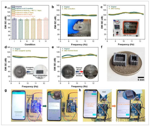 图5、EMI shielding stability of A-MCA under harsh conditions and its practical applications. (a) EMI SE performance of A-MCA-4 after storage in different environments. (b) EMI SE of A-MCA-4 before and after sonication in water for 1 h. (c) EMI SE of A-MCA-4 before and after heating at 200°C for 3 h in air. (d) EMI SE of A-MCA-4 before and after undergoing cryogenic cycling from ?196°C to 20°C for 20 cycles. (e) EMI SE of A-MCA-4 before and after exposure to rapid thermal shock from ?196°C to 200°C for 20 cycles. (f) Photograph of the shielding shell boxes made from A-MCA-4, placed over a coin for target applications. (g) Application of the customized A-MCA-4 shell to block Bluetooth signal connections by shielding the Bluetooth module receiver area. (h) Application of the customized A-MCA-4 shell to block signal transmission between a card tag and an RFID reader by shielding the RC522 reader chip.