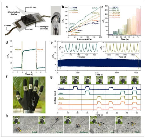 图6、Sensing performance and applications of the MXene/carbon/Ecoflex pressure sensor. (a) Schematic and photograph of the pressure sensor. (b) Relative current change of the sensor as a function of pressure, with sensors varying in the number of printed layers. (c) Relative current change vs. time when various pressures are applied to the sensor. (d) Response and recovery times of the sensor when a pressure of ~40 kPa is applied. (e) Long-term stability of the sensor during compression from 6.5 to 22 kPa under 2000 compression and recovery cycles. (f) Photograph of the smart glove with five sensors fixed near the hand knuckles. (g) Output voltage signals of the sensors corresponding to various hand gestures. (h) Photographs of car motions captured during different hand gestures for moving the car forward, backward, left, and right.