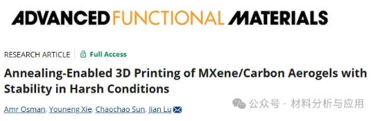 无线技术与微型电子设备的进步,催生了对定制化高性能电磁干扰(EMI)屏蔽材料的需求,这些材料需在恶劣条件下保持稳定性。尽管MXene具有卓越的电学性能和EMI屏蔽特性,但实现MXene气凝胶的强韧稳定性仍具挑战。本文,香港城市大学吕坚教授课题组《ADVANCED FUNCTIONAL MATERIALS》期刊发表名为“Annealing-Enabled 3D Printing of MXene/Carbon Aerogels with Stability in Harsh Conditions”的论文,研究开发了一种退火增强型3D打印工艺,制备出分级结构的MXene/碳气凝胶。