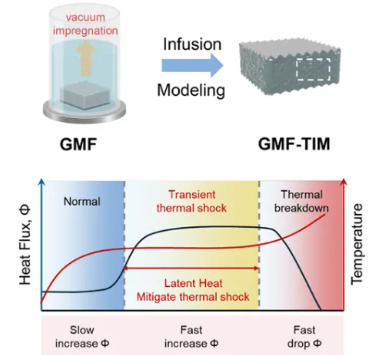 针对这一挑战,北京大学、北京石墨烯研究院邵元龙研究员等团队通过将三(羟甲基)氨基甲烷(Tris)真空浸渍到结构工程化的三维石墨烯微纳空腔薄膜(GMF)中,开发出高性能相变热界面材料。
