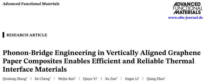 核心性能优势显著:导热性能方面,优化后的 PGPE??样品(PGP 体积分数 35%)面外导热系数高达 456 W/(m?K),远超银(429 W/(m?K))等传统金属,PGPE??样品面外导热系数达 331.51 W/(m?K),较纯环氧树脂提升 2688 倍;界面与力学性能方面, compressive 模量低至 4.8 MPa,总热阻仅 0.23 K?cm2/W,界面接触热阻可低至 0.18 K?cm2/W,能紧密适配界面微观形貌;稳定性与实用性方面,经 10000 次热震循环及 60 W 功率下 8 小时连续运行后,结构与导热性能无明显衰减;器件级测试中,PGPE??使 LED 稳态温度降至 50.6℃(较商用 HD90000 低 6.6℃),CPU 满负荷温度降至 65.2℃(较商用导热硅脂低 4.2℃),风扇失效时仍能维持稳定运行,容错性优异。该方法为高功率电子设备提供了高效、可靠的热管理解决方案,相关研究成果以 “Phonon-Bridge Engineering in Vertically Aligned Graphene Paper Composites Enables Efficient and Reliable Thermal Interface Materials” 为题,发表于《Advanced Functional Materials》。