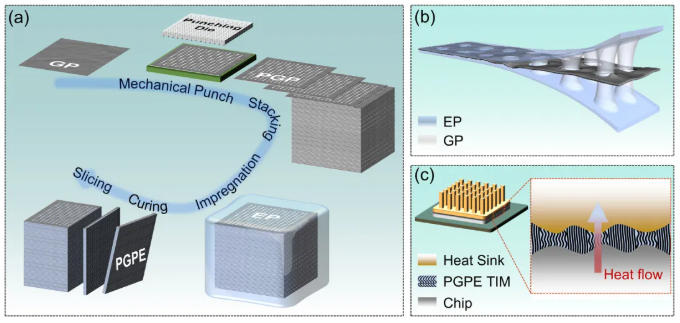 图1. PGPE 复合热界面材料的制备流程与界面耦合原理。(a) PGPE 的制备流程示意图:包括石墨烯纸切割、机械穿孔、堆叠、真空浸渍环氧树脂、固化、切片与抛光等关键步骤;(b) PGP / 环氧树脂复合架构概念图,穿孔结构促进基体渗透与层间连接;(c) 柔性 PGPE 的界面耦合示意图,低模量特性使其能紧密贴合散热器与芯片表面,填充微观空隙。