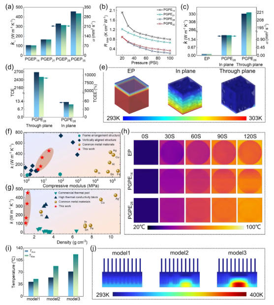 图3. PGPE 的热学性能表征。(a) 不同 PGP 体积分数的 PGPE 样品面外热扩散系数与热导率,随 PGP 含量线性增长,PGPE??热导率达 456.04 W/(m?K);(b) 不同装配压力下 PGPE 样品的总热阻,压力升高热阻显著降低,PGPE??在 100 PSI 下热阻最低;(c) PGPE??的面内与面外导热系数对比,面外导热(331.51 W/(m?K))远高于面内(1.14 W/(m?K));(d) PGPE??相对于环氧树脂的导热增强因子,面外增强 2688 倍,面内增强 12.87 倍;(e) 纯环氧树脂与 PGPE??的稳态温度分布模拟,PGPE??面外方向温度上升显著更低;(f) 本研究 PGPE 与其他碳基热界面材料、金属材料的导热系数 - 压缩模量对比,PGPE 实现高导热与低模量的平衡;(g) PGPE 与商用热界面材料、高导热块体材料、金属的导热系数 - 密度对比,PGPE 兼具低密与高导热优势;(h) EP、PGPE??与 PGPE??的加热过程瞬态表面温度演变,PGPE??升温最快,120 s 时达 97.1℃;(i)-(j) 不同 PGP 分散均匀性的热源平均 / 最高温度及稳态温度分布模拟,均匀分散体系无明显热点,温度最低。