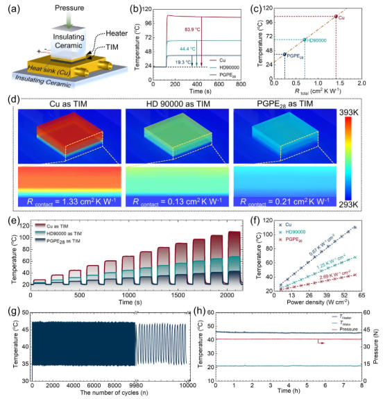 图4. PGPE 的散热性能与稳定性测试。(a) 水冷散热测试系统示意图:陶瓷加热器为热源,TIM 夹于加热器与铜基微通道散热器之间,冷却液循环散热;(b) 60 W 功率下,Cu、HD90000 商用热垫与 PGPE??作为 TIM 时的热源温度演变,PGPE??稳态温升仅 19.3℃,远低于 HD90000(44.4℃)与 Cu(83.9℃);(c) 三种 TIM 的总热阻拟合结果,PGPE??总热阻最低(0.23 K?cm2/W);(d) 宏观与微观尺度界面温度分布模拟,PGPE??实现连续均匀热流传输;(e) 变功率加载下热源温度演变,PGPE??全程温度最低;(f) 加热功率与热源温度的线性关系及等效冷却系数,PGPE??冷却系数达 2.69 W?cm?2?K?1;(g) 10000 次热震循环后 PGPE??的温度稳定性,无明显温升;(h) 60 W 功率下 8 小时连续运行测试,PGPE??稳态温度稳定在 45.6±0.2℃。