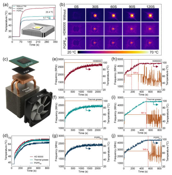 图5. 器件级热管理性能评估。(a) LED 模块在无 TIM、HD90000 与 PGPE??条件下的表面温度演变,PGPE??组稳态温度 50.6℃,较 HD90000 低 6.6℃;(b) 对应 LED 模块的红外热成像图,PGPE??组温度分布最均匀;(c) CPU 散热测试装置示意图:TIM 夹于 CPU 与风冷散热器之间;(d) CPU 满负荷时不同 TIM 的温度演变,PGPE??组稳态温度 65.2℃,优于 HD90000 与商用导热硅脂;(e)-(g) 风扇低转速故障条件下,三种 TIM 对应的 CPU 温度与主频演变,PGPE??组温度最低、稳定性最优;(h)-(j) 风扇完全失效条件下,三种 TIM 的 CPU 温度与主频演变,PGPE??组最晚出现主频节流(548 s),容错性最强。