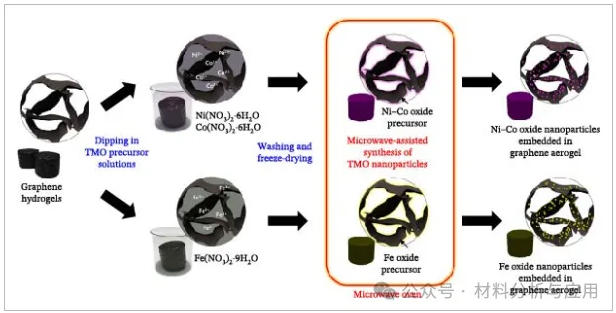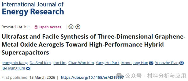 超细非晶纳米颗粒因其巨大的比表面积、良好的分散性、短的离子扩散路径、丰富的缺陷位点以及优异的化学稳定性,已成为储能应用领域极具前景的候选材料。本文,韩国首尔大学Moon Jong Han、Yuanzhe Piao、Ju-Hyung Kim等研究人员在《International Journal of Energy Research》期刊发表名为“Ultrafast and Facile Synthesis of Three-Dimensional Graphene-Metal Oxide Aerogels Toward High-Performance Hybrid Supercapacitors”的论文,研究通过一种超快速且环保的微波辅助方法合成了高性能电极材料,该方法能够产生协同电化学效应。将氧化铁和镍-钴氧化物纳米颗粒分别嵌入石墨烯气凝胶(GA)中作为负极和正极,从而形成高性能混合超级电容器(HSC)。