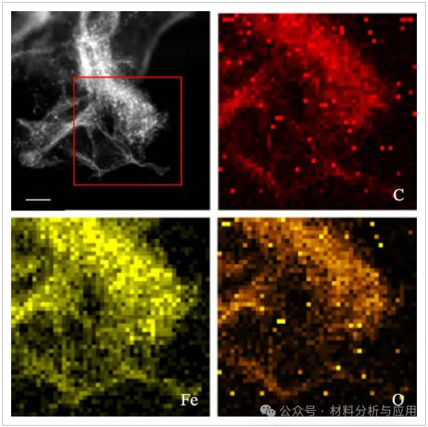 图3、(a, b) TEM image and enlarged view of GA/Fe. (c) EDS elemental mapping images of GA/Fe showing Fe (yellow), C (red), and O (orange); the red box indicates the EDS mapping area. (d, e) TEM image and enlarged view of GA/NC. (f) EDS elemental mapping images of GA/NC showing C (red), Ni (cyan), and Co (yellow); the red box indicates the EDS mapping area. All samples were subjected to 60?s of microwave irradiation. Scale bars in (c) and (f) are 50?nm.