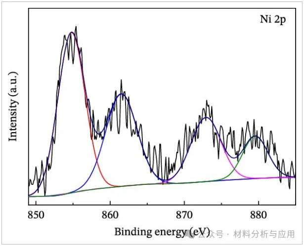 图4、(a) XRD patterns of GA, GA/Fe, and GA/NC. Black bar markers indicate the positions of weak diffraction features detected in the experimental patterns, while the overall broad background reflects the dominant contribution from the GA framework. Reference peak positions corresponding to reported spinel NiCo2O4 phases (indicated by yellow diamonds) and spinel-type iron oxides (indicated by green diamonds) are marked to guide phase identification. XPS spectra of (b) GA/Fe and (c, d) GA/NC composites: (b) Fe 2p, (c) Ni 2p, and (d) Co 2p. All samples were subjected to 60?s of microwave irradiation.