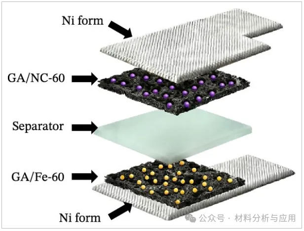 在本研究中,通过一种家用微波辅助方法成功制备了三维石墨烯-TMO复合材料。热烧结步骤通常是传统合成中最耗时的阶段,但在本研究中仅需1分钟即可完成。这种超快且环保的加热过程使得超细非晶态TMO纳米颗粒在宏观多孔的GA骨架内均匀分布。经优化的GA/Fe和GA/NC电极在三电极配置下表现出优异的电化学性能,在1 A/g电流密度下分别展现出714.4和521.4 C/g的比容量。组装而成的GA/Fe||GA/NC高比容量电池展现出0.36 C cm?2的高面容量、1.5 V的扩展工作电压以及卓越的长期稳定性,即在13,000次循环后仍保留约90%的初始容量,且库仑效率接近100%。这些卓越性能归因于以下协同效应: