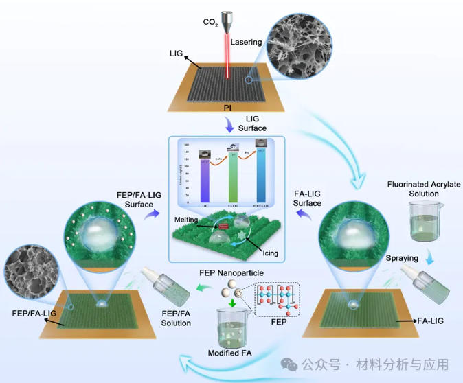研究首先通过激光扫描聚酰亚胺(PI)薄膜表面原位制备多孔 LIG 结构,随后采用 FEP/FA 溶液进行喷涂处理并经热处理固化,最终获得兼具分级结构和低表面能的超疏水复合涂层。