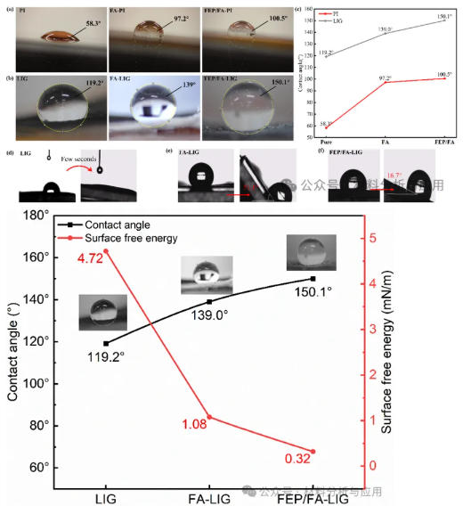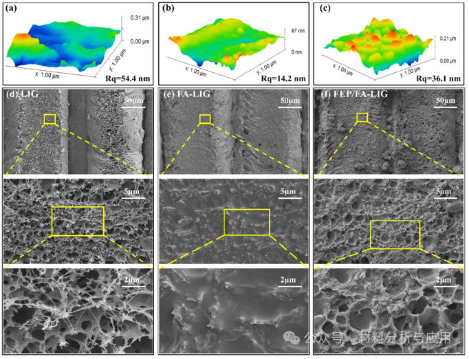AFM 和 SEM 结果表明,原始 LIG 具有典型的多孔石墨烯网络结构;引入 FA 后,表面趋于更均一平整;进一步掺杂 FEP 纳米颗粒后,表面重新形成更明显的微/纳复合粗糙结构。这种分级结构为后续超疏水界面的形成提供了关键形貌基础。