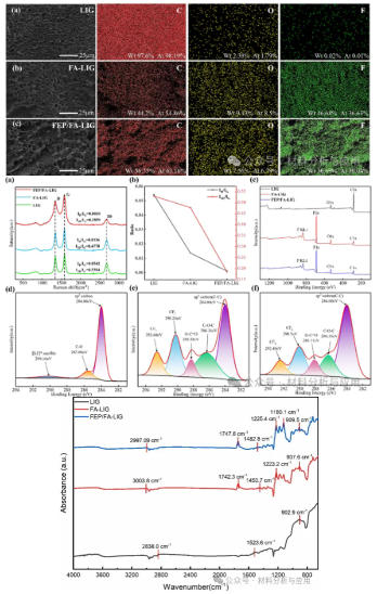 通过 EDS、Raman、XPS 和 FTIR 等表征手段,系统揭示了 FEP/FA 对 LIG 表面组成和化学状态的调控作用。EDS 结果表明,碳、氧、氟等元素在复合涂层表面分布较为均匀,说明 F 元素已成功引入 LIG 表面。Raman 光谱中可观察到典型的 D、G 和 2D 峰,证明激光成功诱导形成石墨烯结构;同时,掺杂改性后 ID/IG 与 I2D/IG 比值的变化表明,表面改性不仅影响了石墨烯的缺陷程度,也调控了其多层结构和表面微纳形貌。XPS 测试进一步证实了含氟官能团的引入,尤其是 CF?、CF? 等特征键信号的出现,说明 FEP/FA 成分已稳定结合于 LIG 表面。FTIR 结果与 XPS 相互印证,进一步表明复合改性有效构建了富含氟基团的低表面能界面,为材料获得优异疏水与防冰性能奠定了化学基础。
