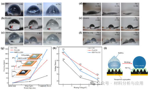 在低温条件下,原始 LIG、FA-LIG 和FEP/FA-LIG 的结冰行为表现出明显差异。其中,FEP/FA-LIG 的完全结冰时间延长至343 s,较原始 LIG 显著提高,表明其在延缓冰核形成和抑制冰层快速生长方面具有明显优势。除冰测试表明,在外加电压作用下,该复合涂层能够实现更高效的电热除冰。