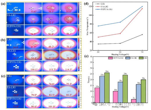 红外热成像结果显示,FEP/FA-LIG 涂层在低电压驱动下即可实现快速、均匀升温。在 7 V 条件下,其最高温度可达 120.0 ℃,并在极短时间内达到峰值,表现出优异的电热转换效率和快速响应能力。