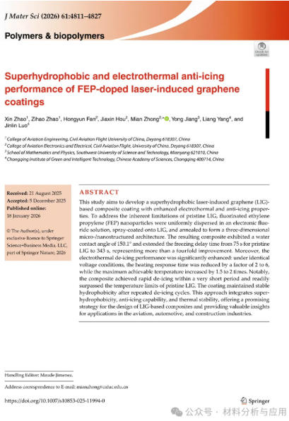 在极端低温环境下,结冰问题长期困扰航空、输电、风电及交通系统。传统机械除冰和化学融冰方式能耗高、维护复杂,难以满足轻量化和高效化需求。如何实现“主动加热 + 被动抗冰”协同防护,成为当前材料领域的重要课题。近日,中国民用航空飞行学院赵欣教授、钟勉副教授等研究人员在《Journal of Materials Science》期刊发表题为“Superhydrophobic and electrothermal anti-icing performance of FEP?doped laser-induced graphene coatings”的论文,研究通过提出将氟化乙烯丙烯共聚物(FEP)纳米粒子分散于电子氟化液(FA)中,通过喷涂辅助化学气相沉积法,结合热固化处理对激光诱导石墨烯(LIG)进行掺杂改性,成功构建了兼具微/纳分级结构及低表面能的FEP/FA-LIG复合涂层。