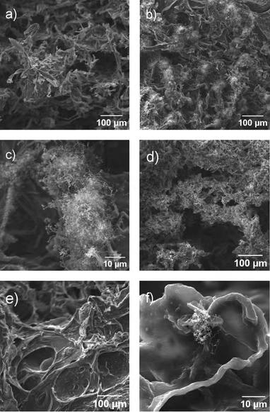 图4、SEM images of bio-based carbon aerogels: (a) Rp + c + Fe-CVD, (b) and (c) Rp + cg + Fe-CVD, (d) Rp + c + Fe2-CVD, and (e) and (f) Rp + cg + Fe2-CVD.