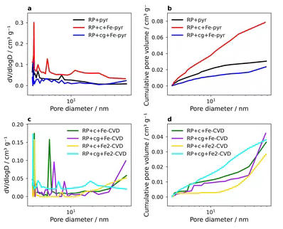 图5、(a) BJH pore size distribution (PSD) of pyrolyzed aerogels. (b) Cumulative pore volume of pyrolyzed aerogels. (c) BJH PSD of CVD-modified aerogels. (d) Cumulative pore volume of CVD-modified aerogels. PSD curves were obtained from the desorption branch of the N2 sorption isotherms using the BJH method.