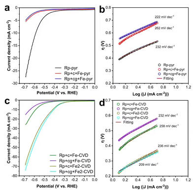 图6、Electrocatalytic performance towards the hydrogen evolution reaction of bio-based carbon aerogels. (a) Polarization curves and (b) Tafel slope of aerogels subjected to pyrolysis. (c) Polarization curves and (d) Tafel slope of aerogels subjected to CVD.