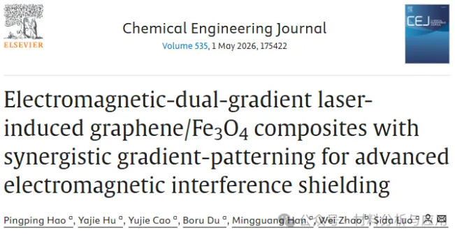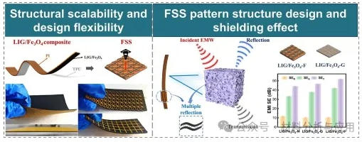 随着电磁干扰(EMI)日益普遍,市场对兼具强衰减性能和极低反射率的屏蔽材料的需求日益增长。尽管传统的金属基屏蔽材料存在密度高、易腐蚀且反射主导等缺陷,本文,北京航空航天大学罗斯达 教授团队在《Chemical Engineering Journal》期刊发表名为“Electromagnetic-dual-gradient laser-induced graphene/Fe3O4 composites with synergistic gradient-patterning for advanced electromagnetic interference shielding”的论文,研究提出了一种简便、可扩展且可定制的制备方法,用于制造集成频率选择性表面(FSS)图案的激光诱导石墨烯/Fe3O4梯度复合材料(LIG/Fe3O4)。