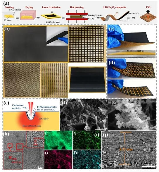 图1. (a) Schematic illustration of the preparation process for the LIG/Fe3O4 composite; (b) the structural scalability and design flexibility of LIG/Fe3O4 composite paper are demonstrated: including large-area samples (50 × 30 cm2), the illustration shows the vertical conductive pathways in the thickness direction constructed through double-sided laser irradiation; three patterned samples with different periodic arrays (square, wavy, and sawtooth); and the square resistance gradient changes achieved in sixteen strip regions by adjusting the laser power (0.25 W to 10 W); (c) and (d) macroscopic photograph of the as-prepared five-layer LIG/Fe3O4 composite with a total thickness of 0.59 mm, and the LIG/Fe3O4 with different surface patterns; (e) schematic illustration of the preparation process for the LIG/Fe3O4 composite; (f) SEM morphology characterization of the LIG/Fe3O4 composite; (g) SEM image showing the morphology of Fe3O4 anchored on the LIG skeleton; (h) HRTEM analysis of LIG and Fe3O4 nanopartic les (inset shows the Fast Fourier Transform pattern of the corresponding lattice fringes, where the lattice fringe spacings of LIG and Fe3O4 nanoparticles are 0.34 nm and 0.21 nm, respectively); (i) EDS elemental distribution maps of C, O, N, and Fe; (j) cross-sectional structure of the multilayer LIG/Fe3O4 composite.