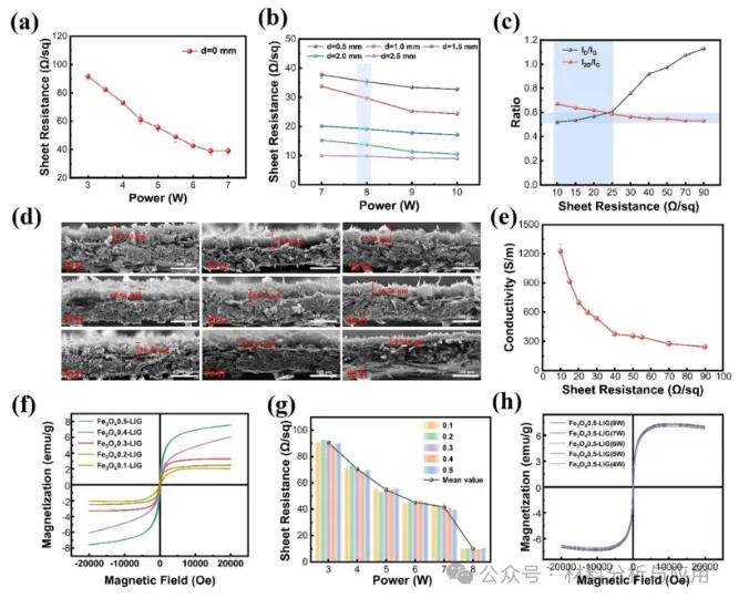 图2. (a) Effect of laser power (3–7 W) on the sheet resistance of LIG under focused conditions (defocus distance of 0 mm); (b) effect of defocus distance (0–2.5 mm) on the sheet resistance of LIG at high power levels (7–10 W); (c) Raman spectra and ID/IG, I2D/IG ratio variations of LIG samples processed with different laser parameters; (d) cross-sectional SEM image of the LIG conductive layer (for thickness t measurement); (e) calculated electrical conductivity of LIG; (f) magnetic properties of LIG/Fe3O4 composites prepared with different FeCl3 concentrations; Independent tuning of electrical and magnetic parameters in LIG/Fe3O4 composites: (g) variation of sheet resistance with different FeCl3 concentrations and laser powers; (h) Hysteresis loops of samples prepared at different laser powers (4–8 W) with fixed FeCl3 concentration (0.5 g/mL).