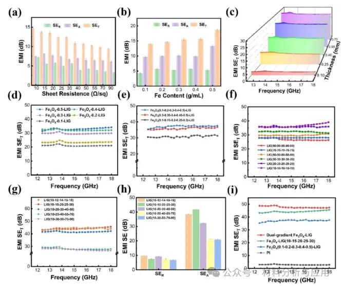 图3. EMI Shielding performance of monolayer LIG/Fe3O4 composites: (a) SET of monolayer LIG materials with different sheet resistances (10–90 Ω/sq); (b) effect of different Fe3O4 loadings (corresponding to FeCl3 concentrations of 0.1–0.5 g/mL) on SET at a fixed sheet resistance of 10 Ω/sq; (c) SET test results for LIG/TPU composites with different numbers of layers (2–6 layers, corresponding to thicknesses of 0.10–0.70 mm); (d) EMI shielding performance of non-gradient five-layer composites with different Fe3O4 loadings; (e) comparison of EMI shielding performance among five-layer composites with different magnetic gradient structures; (f) EMI shielding performance of non-gradient LIG/Fe3O4 composites with different sheet resistances; (g) EMI shielding performance of five-layer composites with different sheet resistance gradient structures; (h) analysis of shielding mechanism composition for electrical gradient structures: Comparison of SET, SEA, and SER between LIG (10-15-20-25-30) and LIG (10-12-14-16-18); (i) EMI performance of the functionally LIG/ Fe3O4 composites.