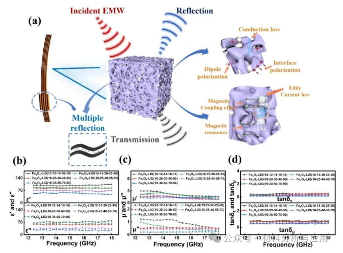 图4. (a) Schematic illustration of the electromagnetic interference shielding mechanism in LIG/Fe3O4 composites; electromagnetic parameter frequency characteristics of materials with different gradient configurations: (b) frequency spectra of complex permittivity real part (ε′) and imaginary part (ε″); (c) frequency spectra of complex permeability real part (μ″) and imaginary part (μ″); (d) dielectric and magnetic loss tangents of materials with different gradient structures.