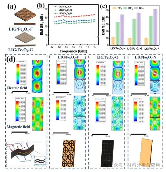 图5. Structural design and shielding effectiveness of LIG/Fe3O4 composites with different surface patterns: (a) Schematic diagrams of generally patterned (LIG/Fe3O4-G) and FSS-patterned (LIG/Fe3O4-F) samples; (b) comparison of SET among the three types of samples; (c) comparison of SET, SER, and SEA values for LIG/Fe3O4-N, LIG/Fe3O4-G, and LIG/Fe3O4-F; (d) HFSS simulation of electromagnetic field distribution in composites with different patterns: electric field norm distribution cloud map and magnetic field norm distribution cloud map.