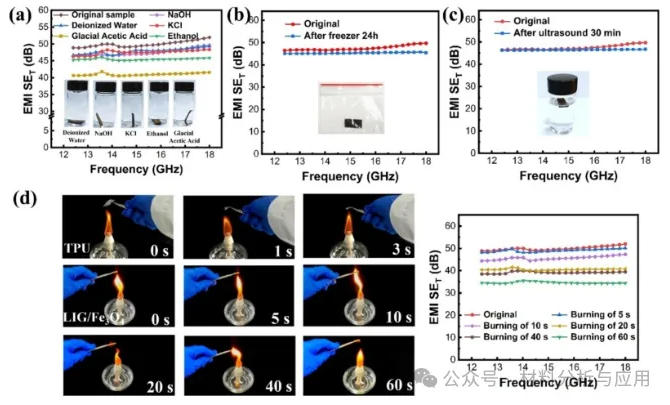 图6. Shielding performance of LIG/Fe3O4 composites under harsh environmental conditions: (a) EMI SE variation after immersion in different solvents and photographs of LIG/Fe3O4 composites immersed in different solvents; (b) EMI SE of the sample after 24 h of freezing at ?18 °C; (c) EMI SE of the sample after 1 h of ultrasonic cleaning; (d) EMI SE after burning and photographs of LIG/Fe3O4 composites at different burning times.