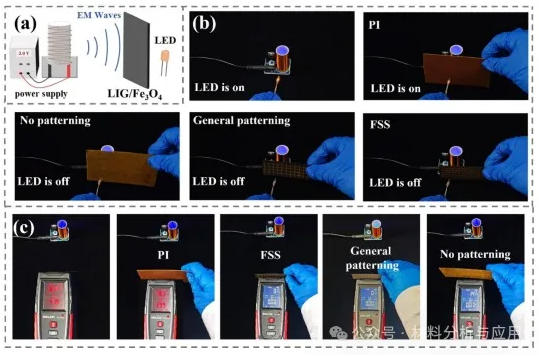 图7. (a) Schematic diagram of the tesla coil electromagnetic shielding demonstration setup; (b) the shielding effect of LIG/Fe3O4 composites (LIG/Fe3O4-N, LIG/Fe3O4-G, and LIG/Fe3O4-F) on LED indicators; (c) validation of the enhanced shielding effect by surface patterning, showing electric and magnetic field radiation values near the patterned sample recorded by an electromagnetic radiation detector.