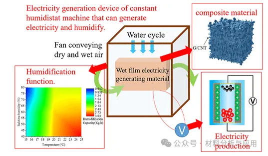 本研究制备的电学器件实现了116 mV的开路电压和1202 nA的短路电流。应避免过量负载G/CNT,否则会导致整个器件导电性过强。使用盐溶液可提供丰富的离子,从而获得更高的电流和电压输出。环境与材料本体之间更大的电位差梯度可提升发电性能。最后,将这种水刺激发电方法集成到恒湿机中,可替代其中的“湿膜”,从而实现湿度控制与发电的同步进行。该集成系统实现了2.99 V的开路电压和1.83 mA的短路电流。在标准工作条件下,采用发电模块作为湿膜的恒湿机,其加湿效率差异小于3%。随着环境温度和风量的增加,相对湿度会降低,这有利于提高加湿能力和发电能力。本研究为发电应用及恒湿机的开发提供了新的见解。未来为提升性能可重点开展以下工作: