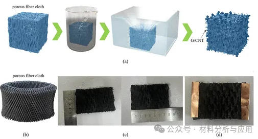 图1. (a) Fabrication of the material. (b) Porous material mixed with EVA and PP fabricated by the spunlaced process. (c) Size of the material. (d) Picture of the generation device.
