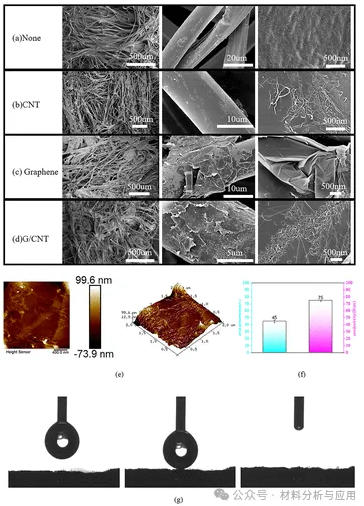 图2. Characterization of the material: (a) SEM of the original material; (b) SEM of the material coated with CNTs; (c) SEM of the material coated with graphene; (d) SEM of the material coated with G/CNTs; (e) AFM of the material with G/CNTs; (f) ζ-potential and conductivity of the material; and (g) the process before, during, and after droplet contact and adsorption.
