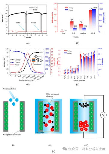 图3. (a) Open-circuit voltage of the device with the material coated with and without G/CNTs; (b) output electrical performance of the device with the different materials; (c) output voltage, current, and power of the device with the material coated with G/CNTs at 40% RH and 25 °C with external resistances varied from 1 to 107 Ω; (d) output electrical performance of the device with different electrodes; and (e) principle diagram.