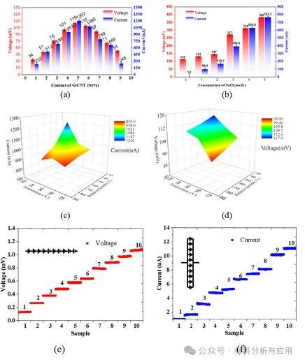 图4. (a) Output power generation performance of the device with different G/CNT contents; (b) output power generation performance of the device under different concentrations of NaCl; (c) short-circuit current of the device under different environmental conditions; (d) open-circuit voltage of the device under different environmental conditions; (e) open-circuit voltage of devices connected in series; and (f) short-circuit current of devices connected in parallel.