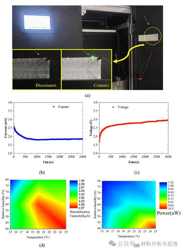 图6. Output performance of the device: (a) constant humidity machine and its application; (b) open-circuit voltage of the constant humidistat machine; (c) short-circuit current of the constant humidistat machine; (d) humidification capacity under 90% air volumes; and (e) power generation performance under 90% air volumes.